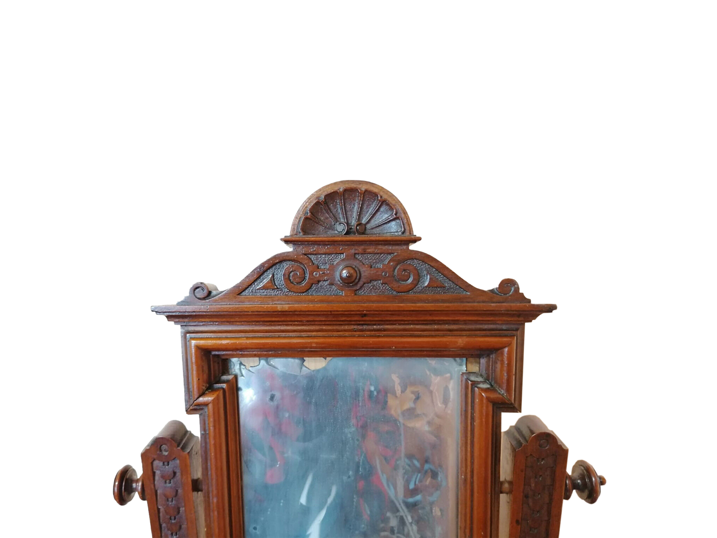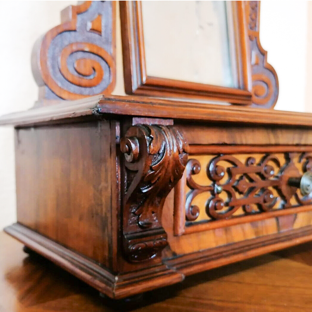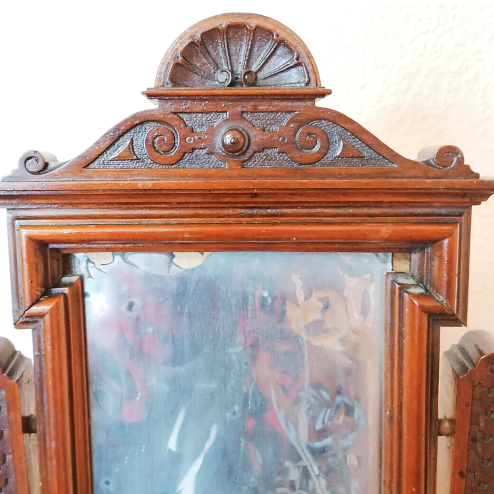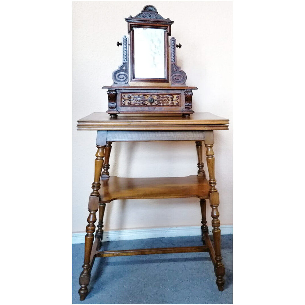 Gründerzeit Psyche - Tischspiegel in Nuss um 1880: Dieses seltene Gründerzeitobjekt besticht nicht nur durch seine zierliche Größe sondern auch durch die exzellente Verarbeitung. Guter Zustand mit einem kleinen Trockenriss in der Ecke. Der Spiegel ist blind und das Silber hat sich oben ein wenig gelöst (siehe Fotos). Als Kunstobjekt belassen wir den Tischspiegel in seinem originalen Zustand, auf Wunsch ersetzen wir den blinden Spiegel, damit er als Spiegel verwendet werden kann. Breite 41,5 cm Höhe 50,0 cm Tiefe 20,5 cm |