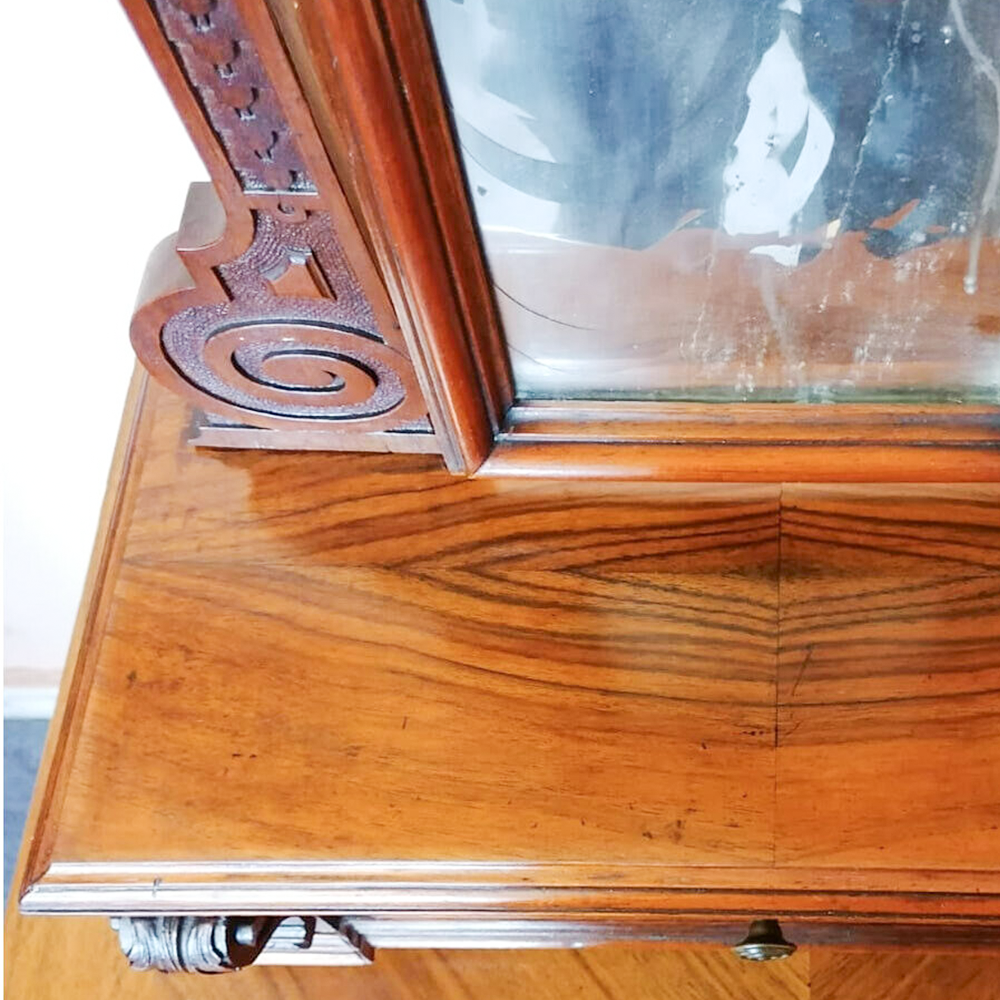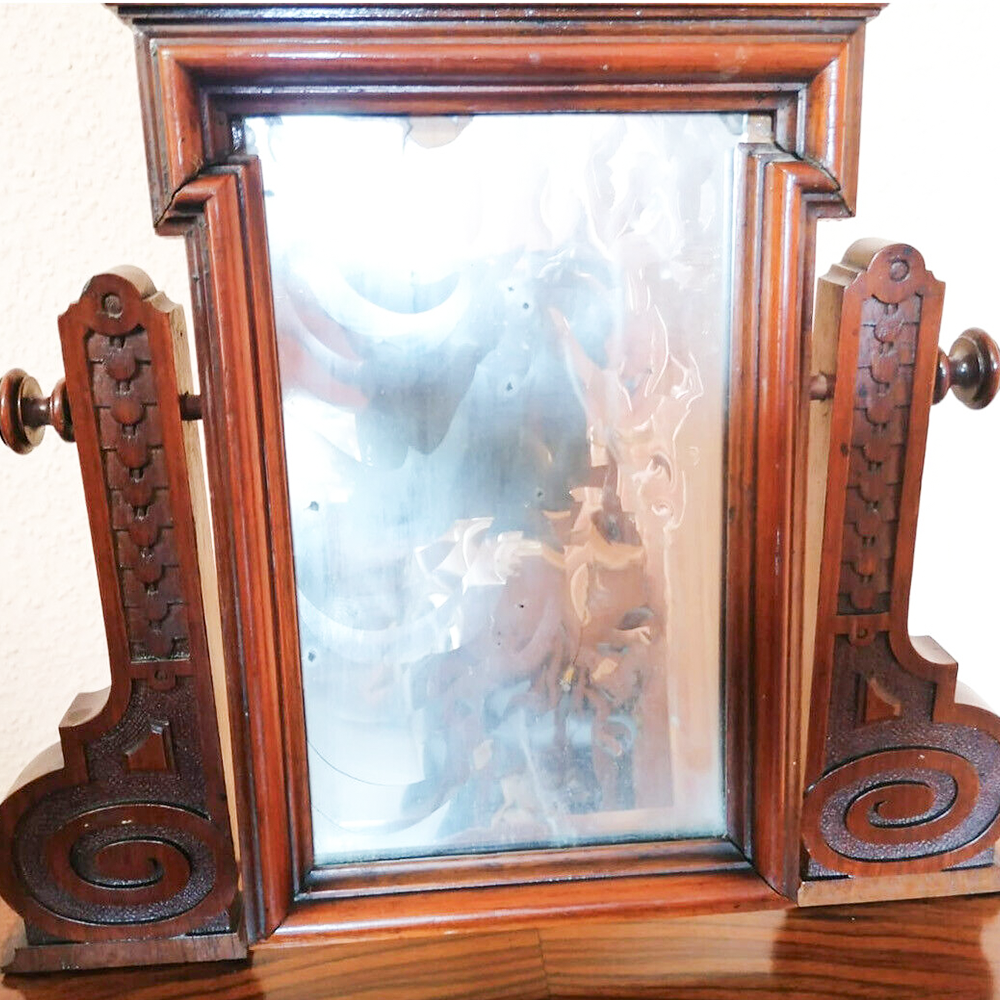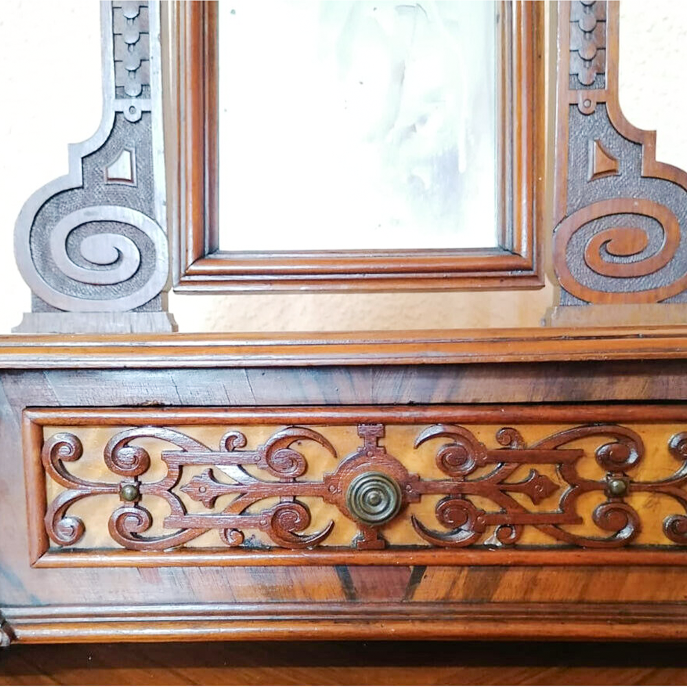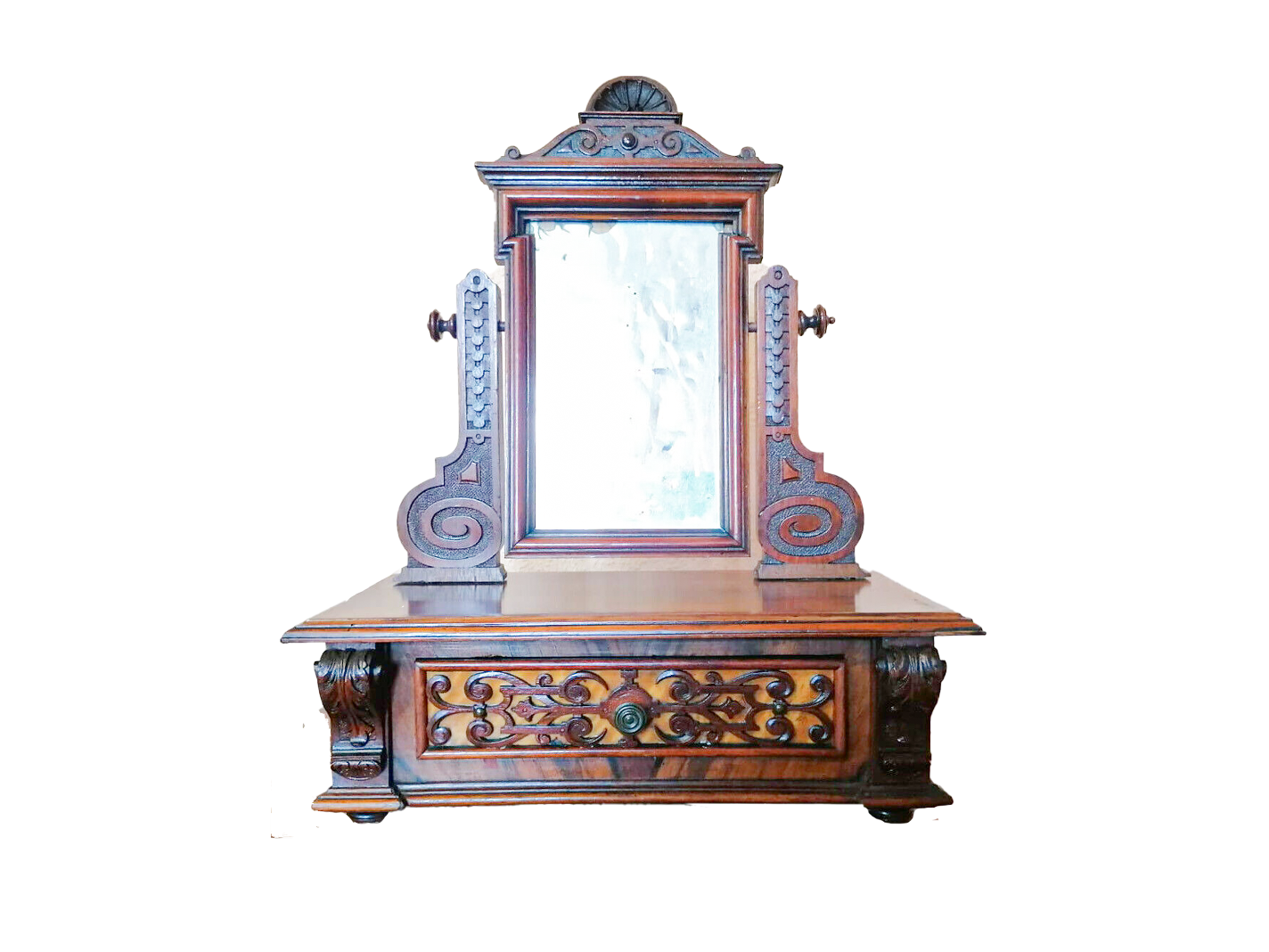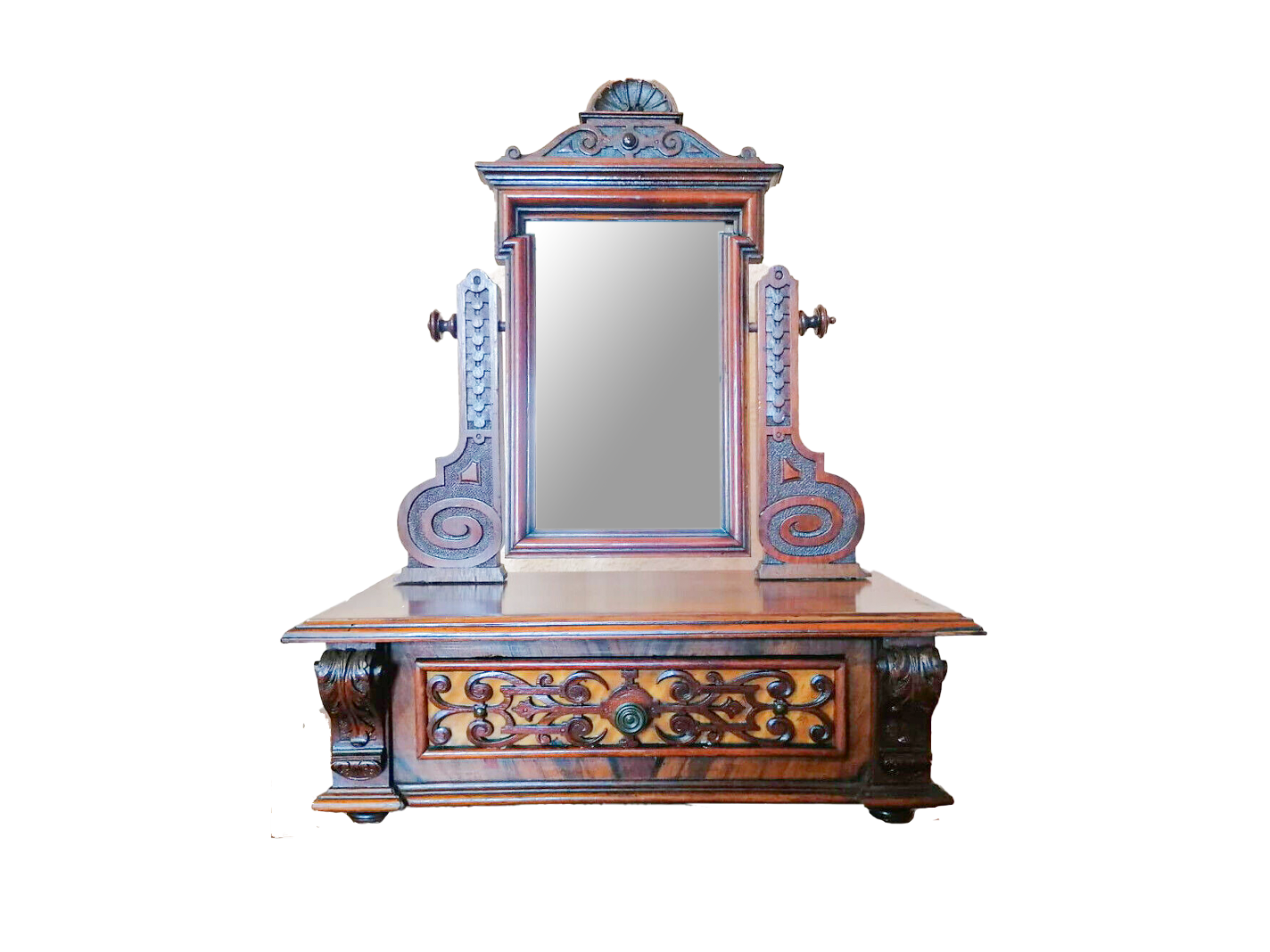 Gründerzeit Psyche - Tischspiegel in Nuss um 1880: Dieses seltene Gründerzeitobjekt besticht nicht nur durch seine zierliche Größe sondern auch durch die exzellente Verarbeitung. Guter Zustand mit einem kleinen Trockenriss in der Ecke. Der Spiegel ist blind und das Silber hat sich oben ein wenig gelöst (siehe Fotos). Als Kunstobjekt belassen wir den Tischspiegel in seinem originalen Zustand, auf Wunsch ersetzen wir den blinden Spiegel, damit er als Spiegel verwendet werden kann. Breite 41,5 cm Höhe 50,0 cm Tiefe 20,5 cm |