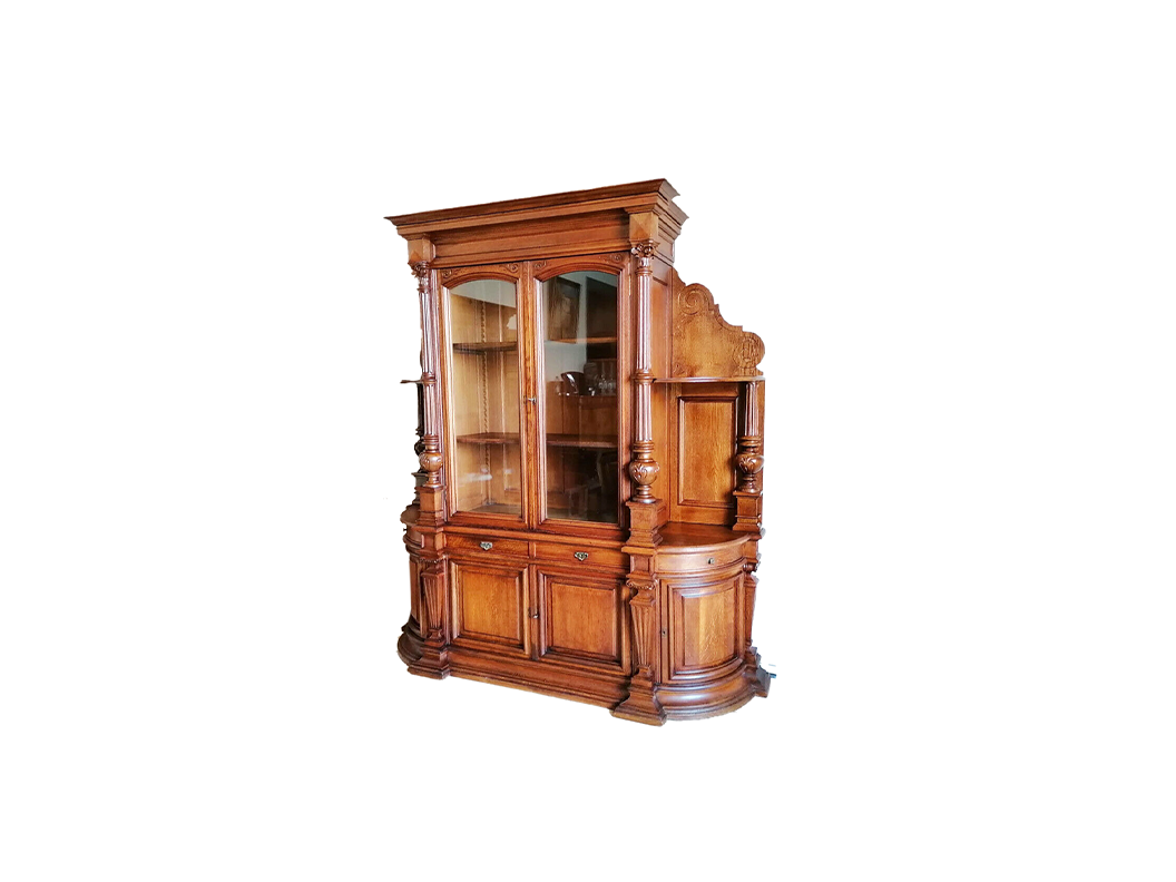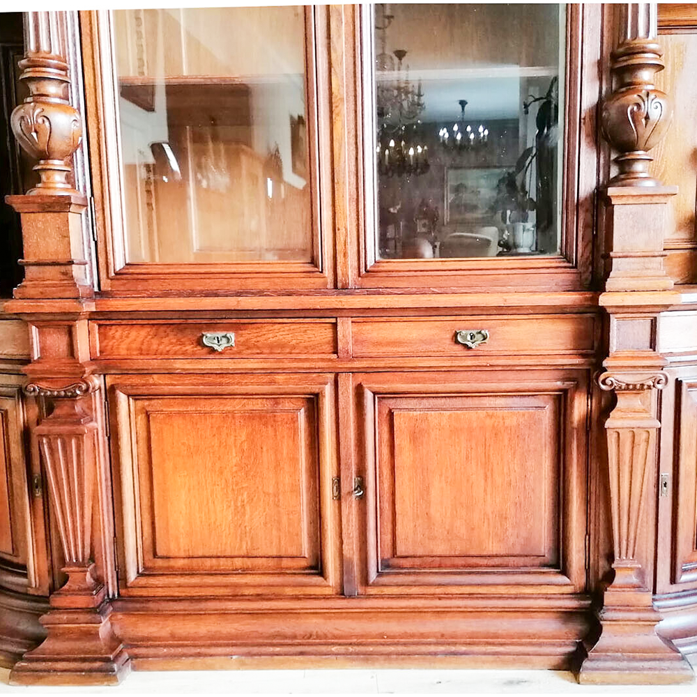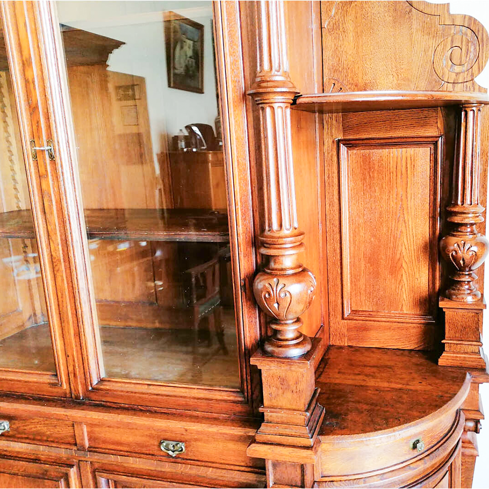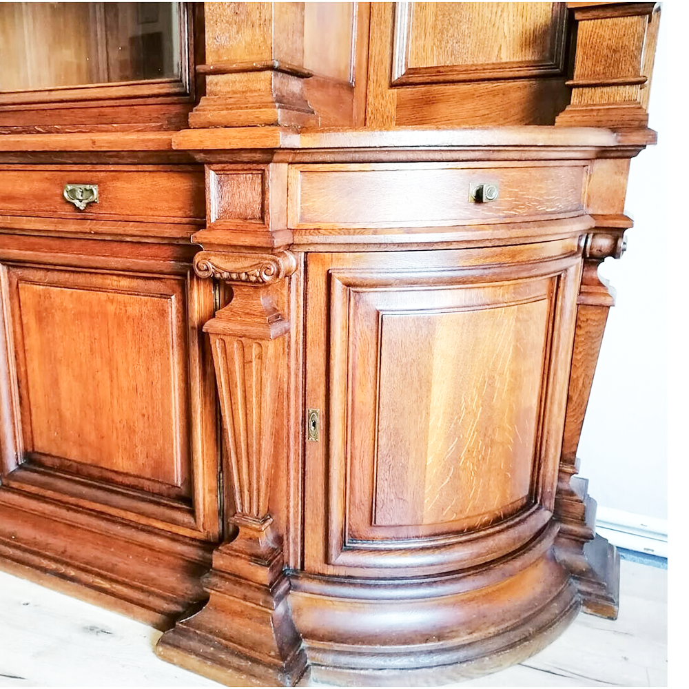 Imposante gründerzeitliche Bibliotheksfront in Eiche. Das Möbel wurde für herrschaftliche Räume gebaut und hat ein beeindruckendes Maß von 2,40 m Breite und 2,25 Meter Höhe. Sowohl im Sockelteil als auch im Glasschrank bietet es ein großes Fassungsvermögen für Bücher, Porzellan, Glas und erlesene Kunstgegenstände.