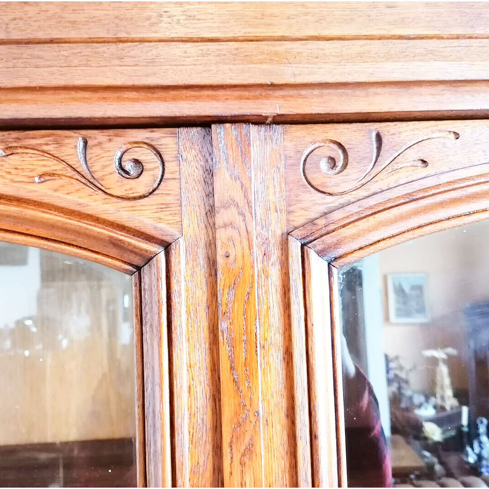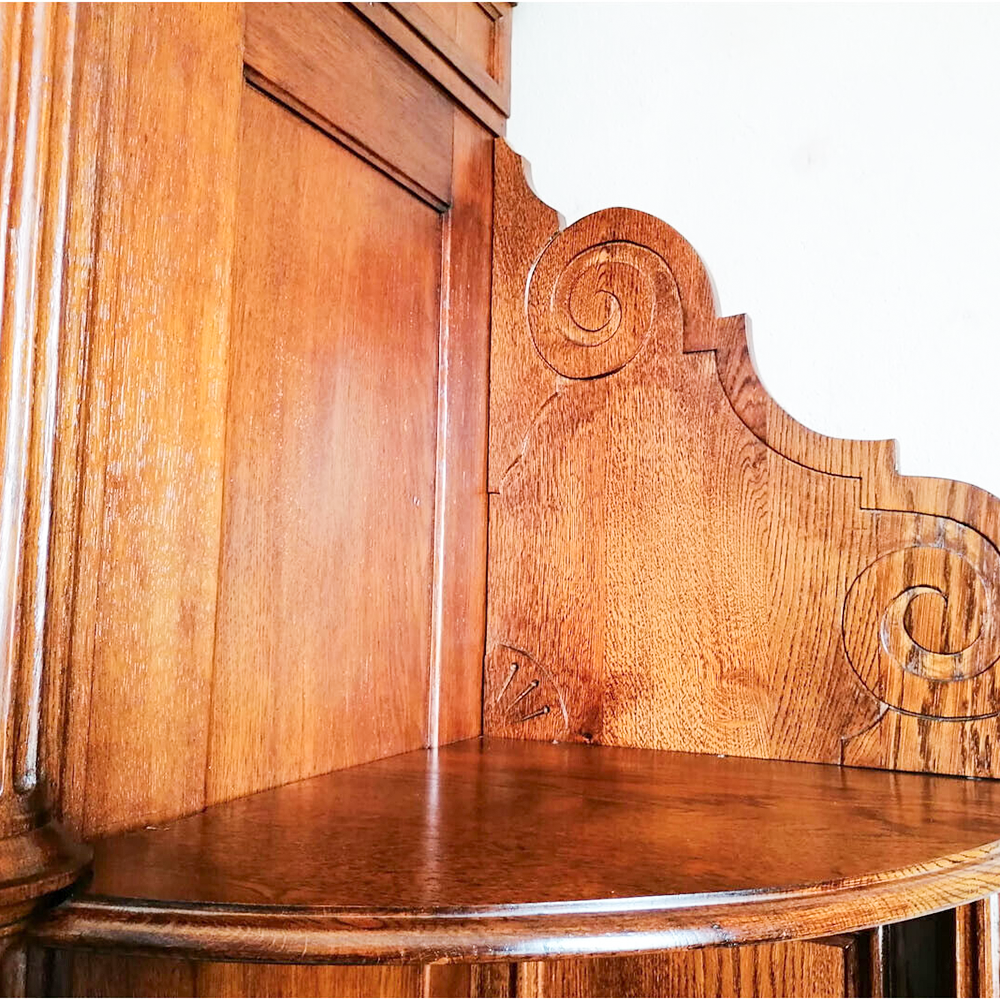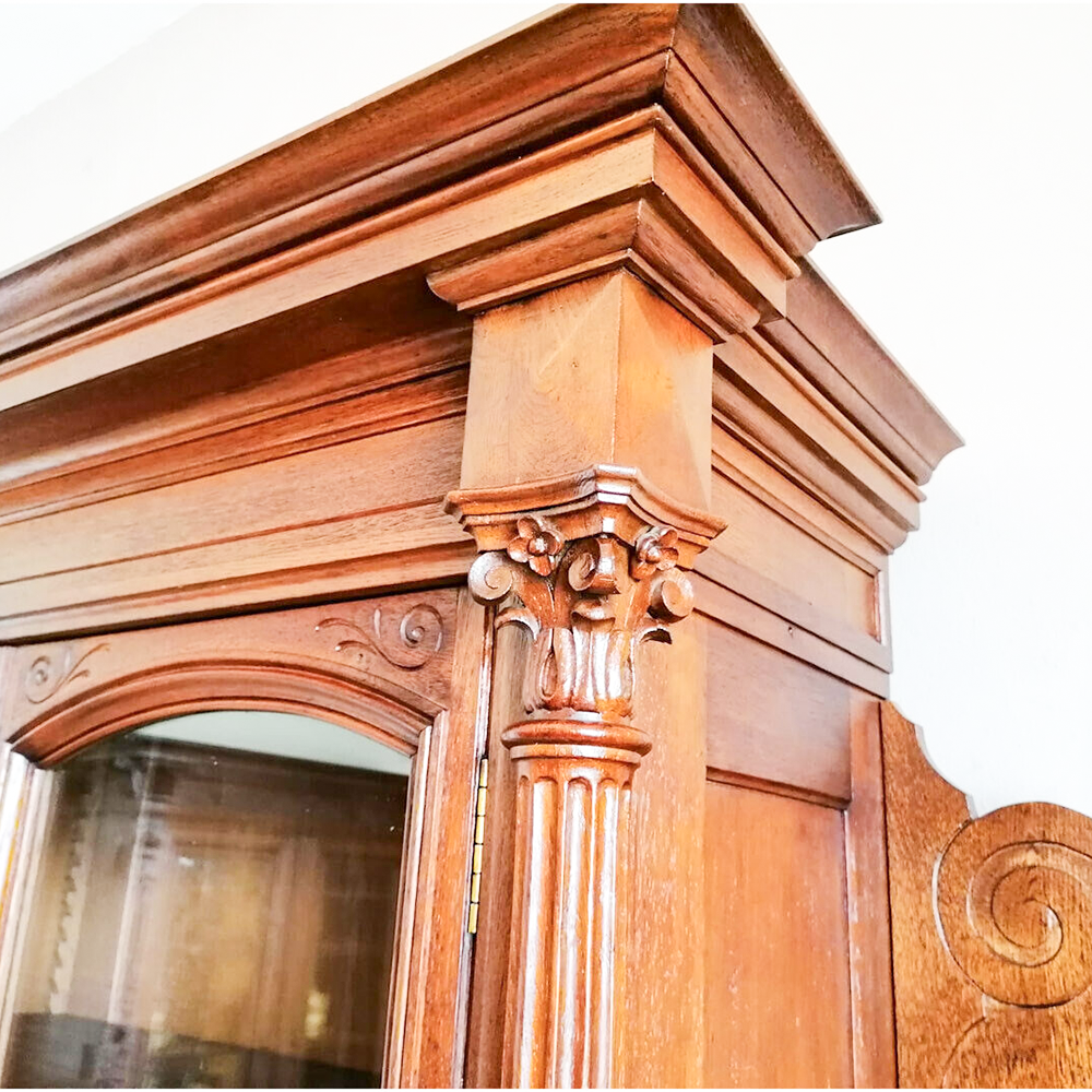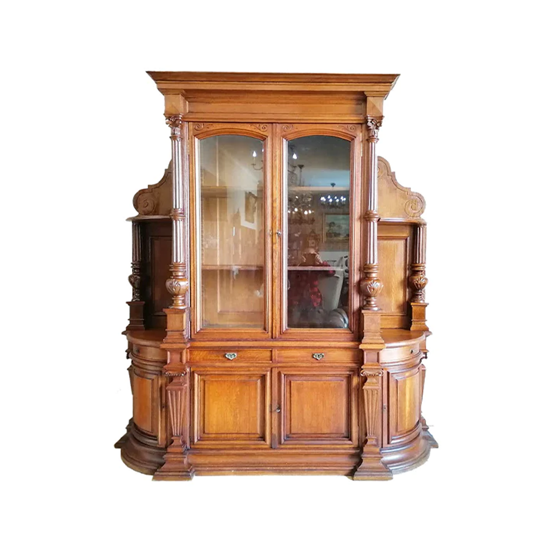 Imposante gründerzeitliche Bibliotheksfront in Eiche. Das Möbel wurde für herrschaftliche Räume gebaut und hat ein beeindruckendes Maß von 2,40 m Breite und 2,25 Meter Höhe. Sowohl im Sockelteil als auch im Glasschrank bietet es ein großes Fassungsvermögen für Bücher, Porzellan, Glas und erlesene Kunstgegenstände.