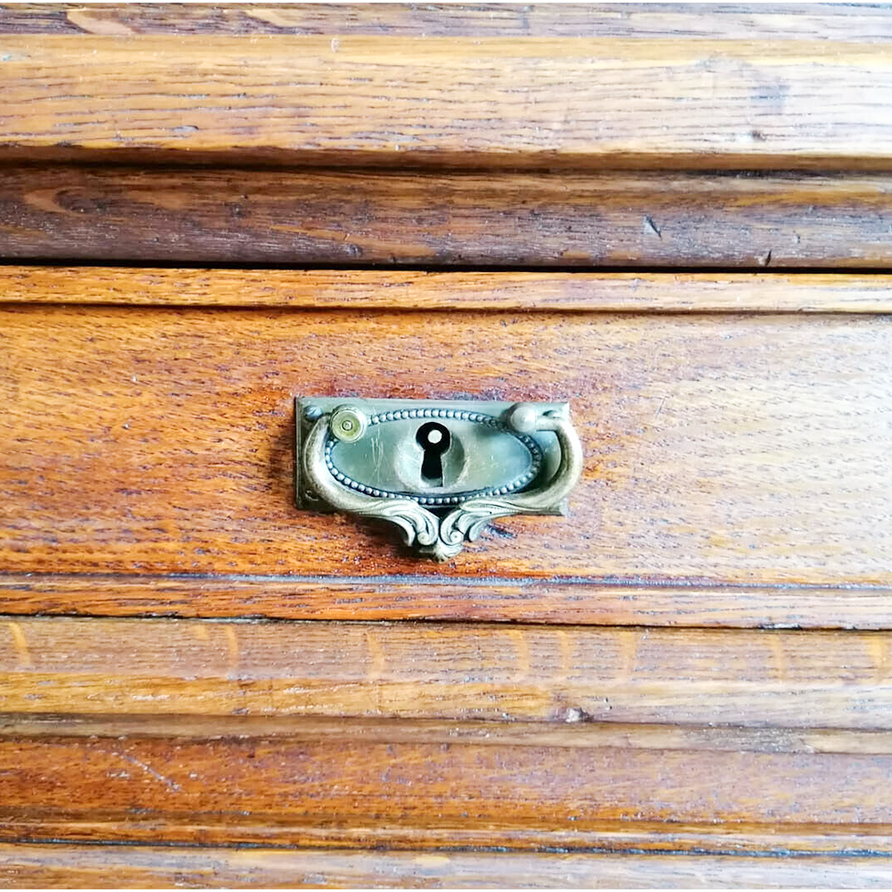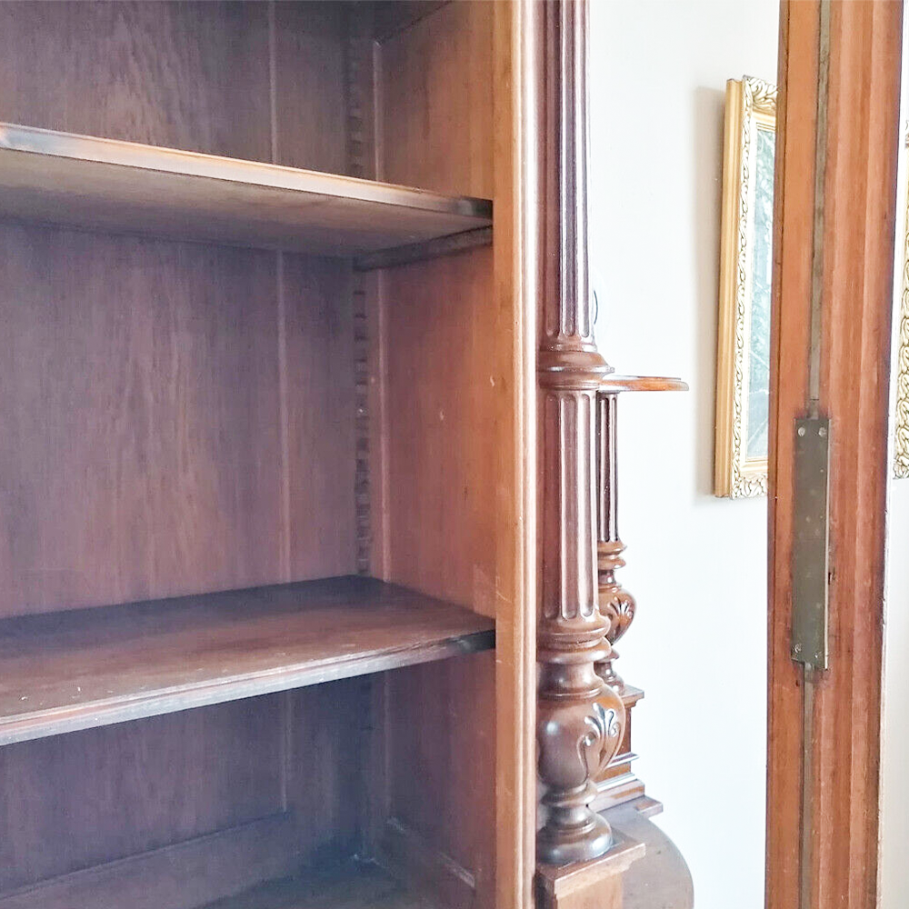 Der Mittelteil, mit den kunstvoll geschnitzten vollplastischen Säulen mit Balustersockel, wird seitlich von einem Volutengiebel begrenzt. Dem geräumigen Unterteil sind zwei halbplastische Säulen vorgeblendet, es ist abgerundet und mit vier Türen zu öffnen. Das Möbel ist wohnfertig restauriert.