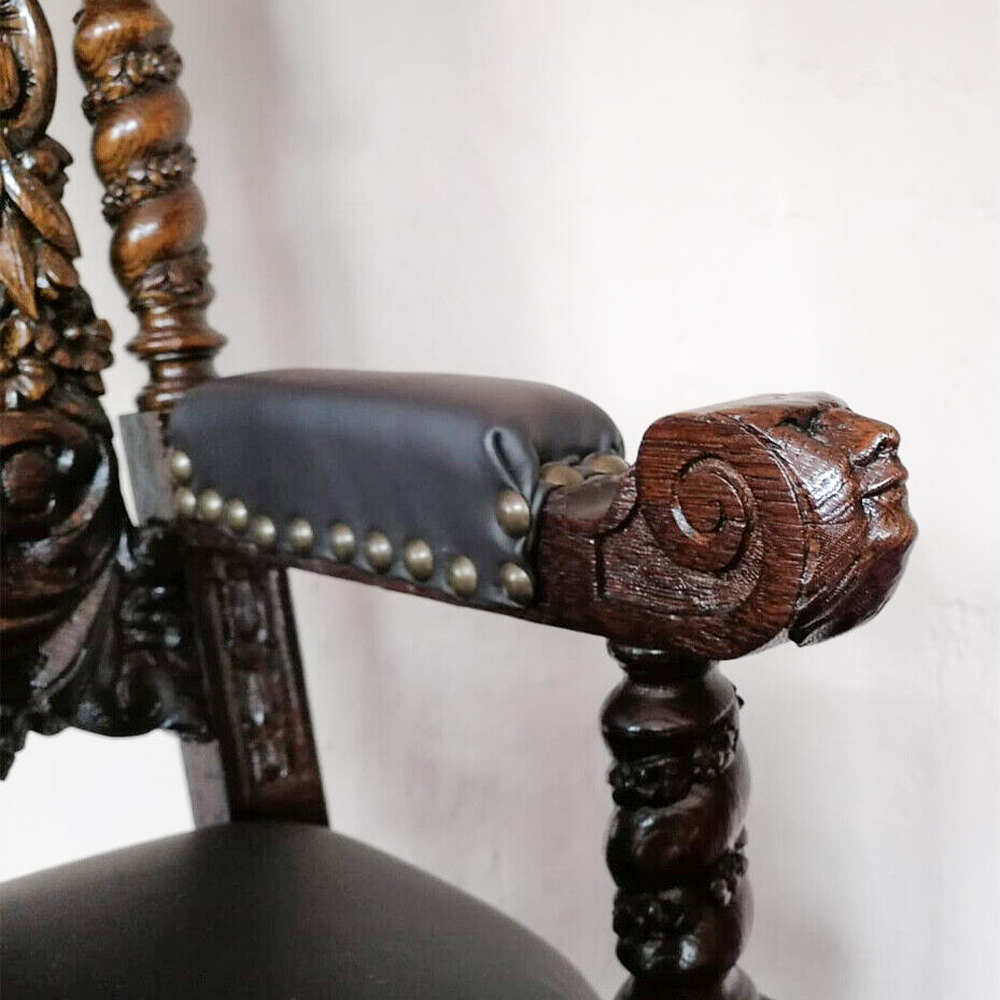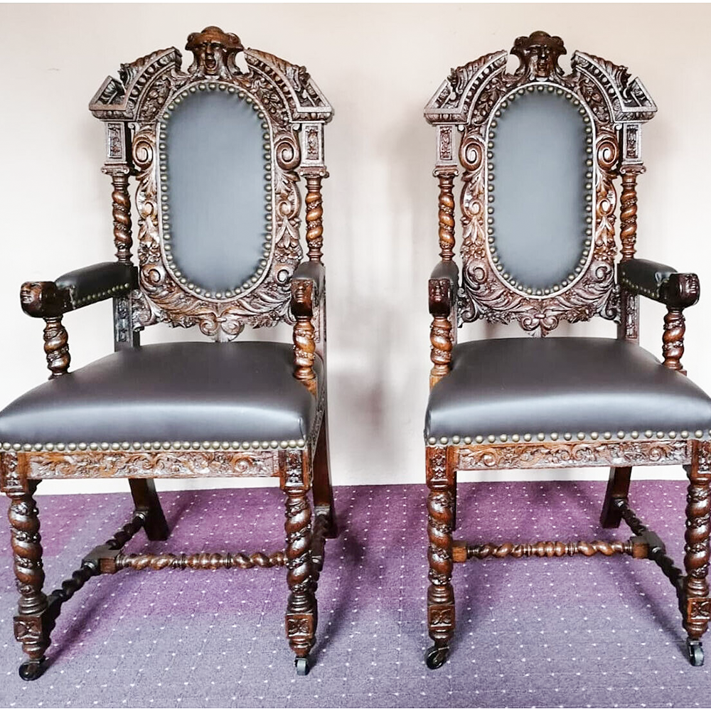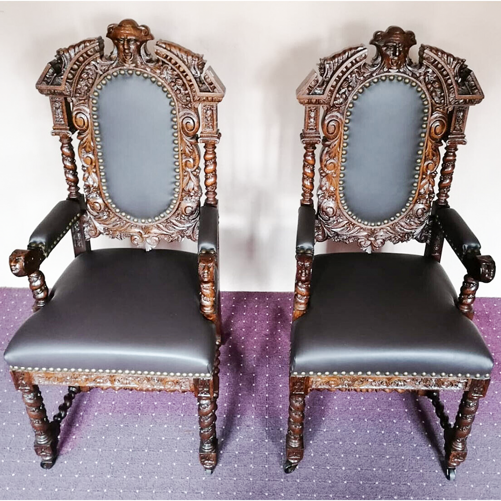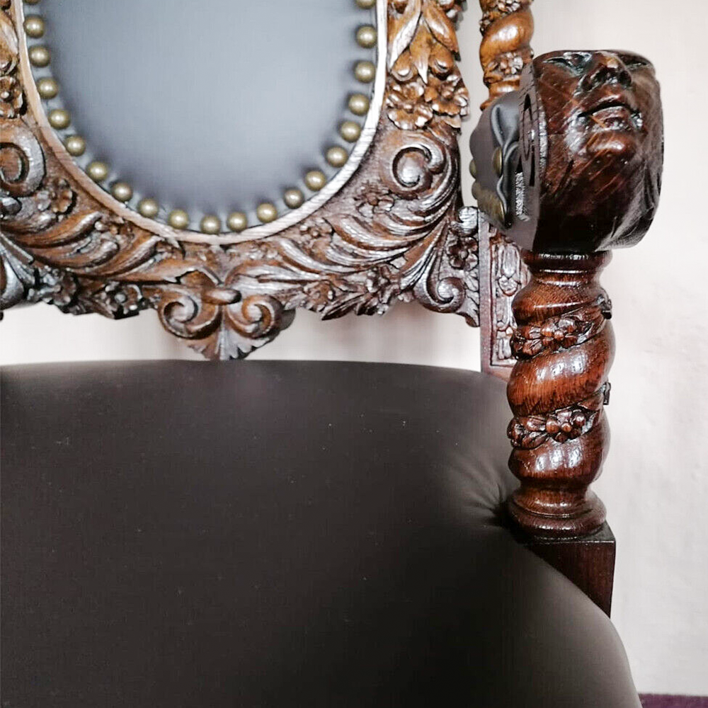 Paar Gründerzeit-Armlehnsessel mit voll- und halbplastischen Schnitzereien in mittlerer bis dunkler Eiche aus der Zeit um 1880. Im Geiste des Historismus sind die Sessel mit prachtvollen Renaissancemotiven beschnitzt. Zwei Gesichter strecken sich an den Armlehnen vollplastisch nach oben, den Abschluss des Stuhles bildet jeweils eine halbplastische Fratze, die in der Mitte eines Sprenggiebels sitzt. Gewundene Säulen verstärken den architektonischen Eindruck der Möbel. Akanthusblätter an Rückenlehne und Zargen betonen den kunstvollen reichen Charakter der Sessel. Die Armlehnsessel stehen vorne auf zwei originalen Rollen. Sie sind in restauriertem wohnfertigem Zustand, die Oberfläche poliert, die Sitzflächen, Armlehnen und die Rückenlehne mit veganem dunkelbraunem Lader bezogen und Ziernägeln beschlagen. Der Preis bezieht sich auf das Paar als Set. Maße:
