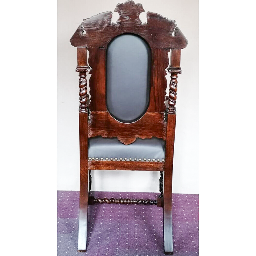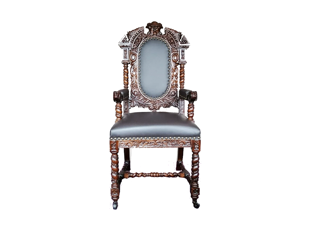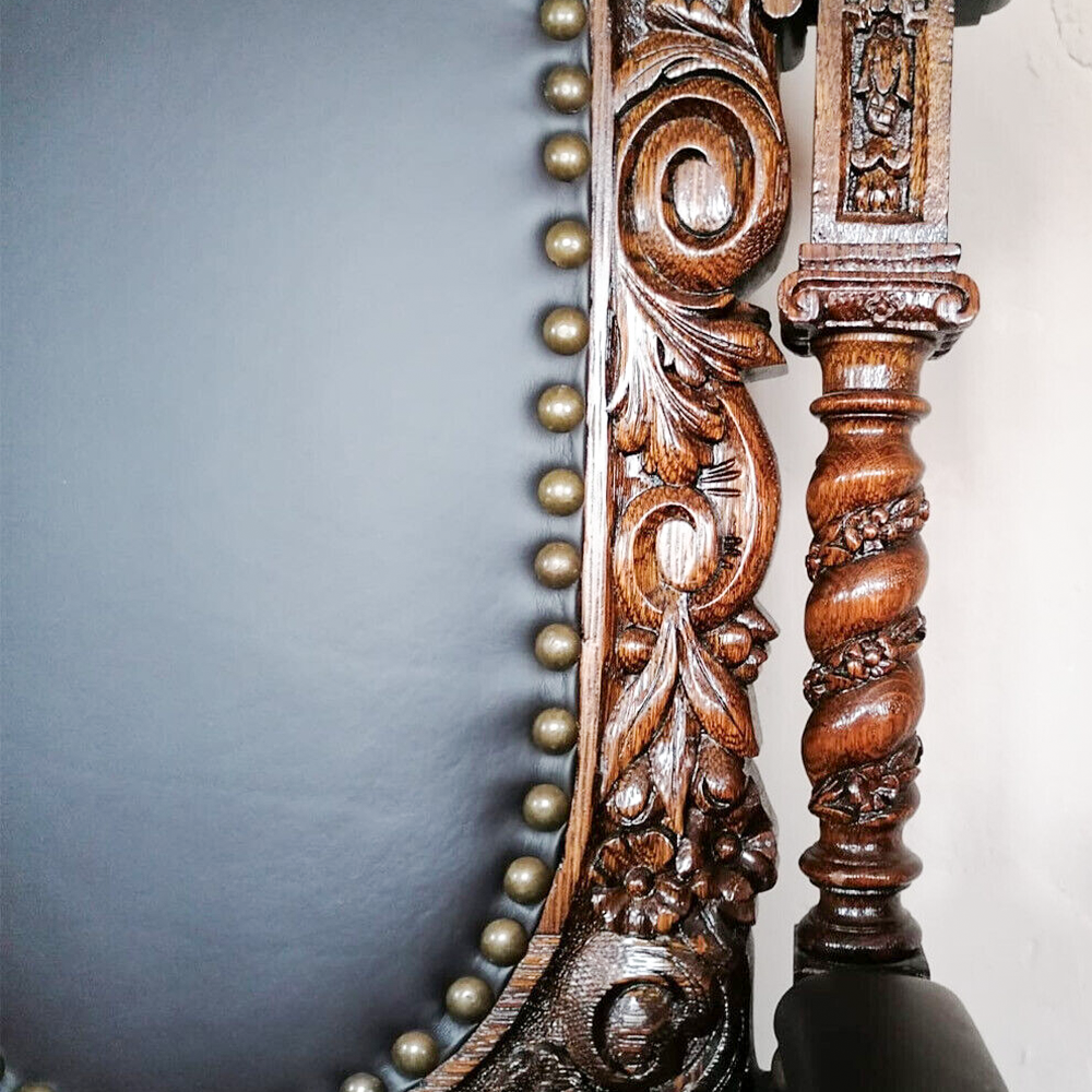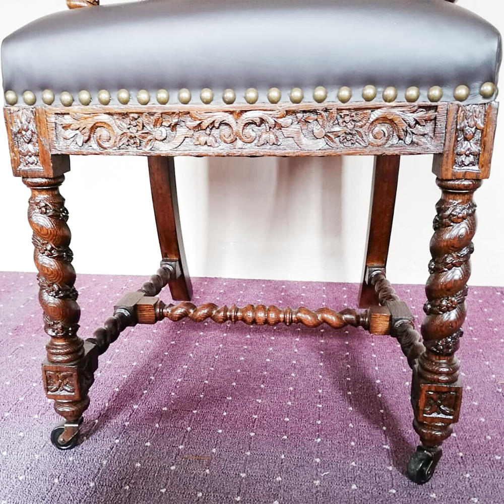 Paar Gründerzeit-Armlehnsessel mit voll- und halbplastischen Schnitzereien in mittlerer bis dunkler Eiche aus der Zeit um 1880. Im Geiste des Historismus sind die Sessel mit prachtvollen Renaissancemotiven beschnitzt. Zwei Gesichter strecken sich an den Armlehnen vollplastisch nach oben, den Abschluss des Stuhles bildet jeweils eine halbplastische Fratze, die in der Mitte eines Sprenggiebels sitzt. Gewundene Säulen verstärken den architektonischen Eindruck der Möbel. Akanthusblätter an Rückenlehne und Zargen betonen den kunstvollen reichen Charakter der Sessel. Die Armlehnsessel stehen vorne auf zwei originalen Rollen. Sie sind in restauriertem wohnfertigem Zustand, die Oberfläche poliert, die Sitzflächen, Armlehnen und die Rückenlehne mit veganem dunkelbraunem Lader bezogen und Ziernägeln beschlagen. Der Preis bezieht sich auf das Paar als Set. Maße:
